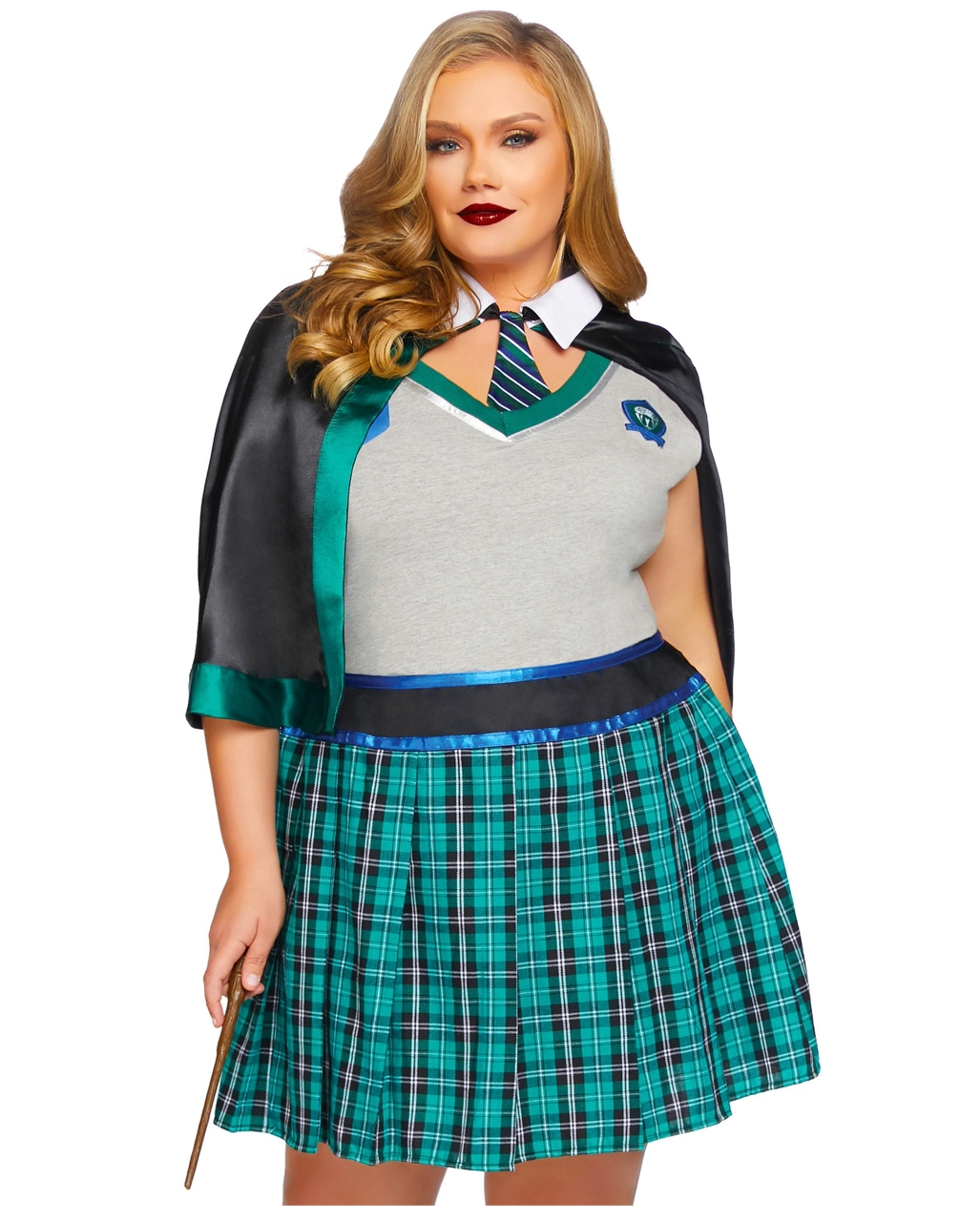 Trotzdem kann es nicht schaden, wenn du den Zauberstab Hermine Granger passend zu deinem Böse Zauberschülerin Kostüm erwirbst. Das Kostüm-Set selbst besteht aus einem sexy Kleid mit grün kariertem Rock, der sehr kurz ist. Das Plus Size Kostüm betont deine Kurven durch das enge Oberteil und den V-Ausschnitt besonders gut. Auf der Brust prangt das Wappen deiner Zauberschule, wahrscheinlich ein Konkurrent von Hogwarts. Weiterhin gehört zu der Schulmädchen Verkleidung auch noch das zauberhafte grün-schwarze Cape und die kleine Krawatte.