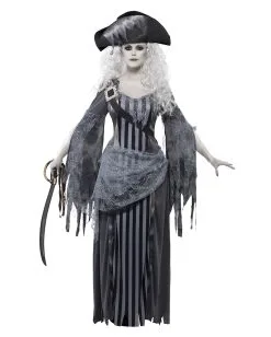 Das Geisterschiff Prinzessin Kostüm besteht aus einem einem Kleid und einem Hut. Das Kleid ist aus dunkelgrauem Stoff und angenähten Stücken Gaze-Stoff mit Spinnwebenmuster. Vorne hat das Kleid schwarze und graue Längsstreifen. An der Hüfte ist ein Tuch mit dem Spinnwebenmuster angebracht. Die Ärmel ab dem Ellenbogen aufgeschlitzt und hängen lang herunter. Schräg über die Brust verläuft ein schwarzer Gürtel. Der fast bodenlange Rock hat unten einen gezackten Saum. Der Hut ist aus schwarzem Stoff und hat vorne ein Stück dreieckig gezackten grauen Stoff angenäht. Du brauchst nur noch eine Piraten Pistole, ein Piratensäbel als Piratenschwert lang 70cm und die Zombie Queen Perücke, um den Rest der Ewigkeit auf Kaperfahrt zu gehen.